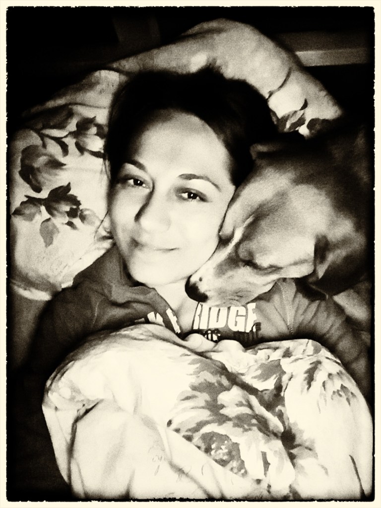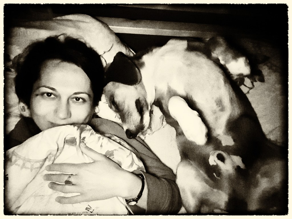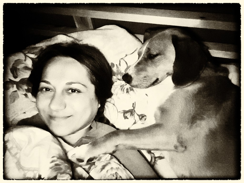 In the first 3 photos you can see Nasuki, who came to share his dreams and love with me last night, adopting different positions according to his dispositions. At first, he used me as a pillow and, of course, I had to stay still, not to disturb his sleep in any way. In the end, he embraced his favourite sleeping position: on his back, legs up, kicking the air every time he dreams himself running. The pictures are not very good. They were taken in the dark, but you get the idea. In the 4th picture, I am with Lala, who is poking my head with her bent leg. I often lie down on the floor when I am tired. I find it very relaxing. And it would be, but, every time, at least one dog, if not all three, comes to keep me company. And their idea of keeping me company is different than mine. They come, lie somewhere near me, and start kicking me with their paws or noses to make 100% sure that I am aware of their presence and start, at once, fulfilling my duties that are, of course, to stroke them … preferably on their bellies. Why else would I lie down if not for that, they wonder? Such opportunistic best friends I have. It is said that one has what one deserves! I have poking dogs.