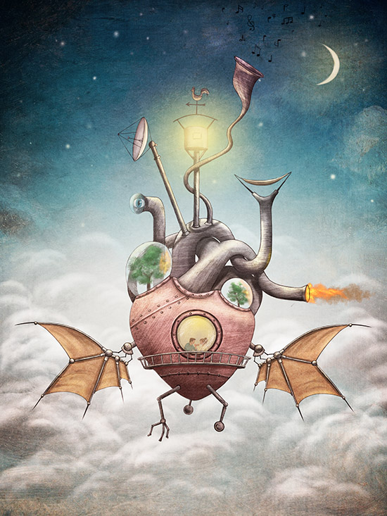 Today, the day of our tenth anniversary, the big mystery was going to be revealed. The waiting was over! I woke up in the morning happy and in a celebration mood. My hubby was already awake, extremely excited. I could feel his energy in the air. He took my hand and guided me outside. The notes of our song were coming from the barn. He told me to close my eyes. I did. He removed the walls of the barn and told me I could watch. At first, I didn’t realize what I was looking at. I had never seen such a thing all my life. A huge hearth shape machine on three legs with some dragon-like wings, a hammock in the top of it and all kind of other weird stuff coming out of it. I still couldn’t imagine what that big machinery was but, I was in awe, anyway. My husband led me inside. An anniversary meal was set up on a lovely wooden table. We sat down and had our special day’s breakfast. While we were sipping our tea, the big machinery started moving through our yard. The tug made me spill some tea on my dress, but it didn’t matter. I felt like dreaming. We were having breakfast in a huge walking heart shape machine. I couldn’t stop thinking of Howl’s Moving Castle. And when I thought I couldn’t ask for more, the machine detached from the ground and rose up in the air. That was beyond anything I had ever lived before! We spent our entire day wander-flying above the clouds. This weird flying machinery was the wedding anniversary that my hubby secretly worked on in our barn for years. He must really love me! And when I think that I bought him a comic book… One of his favorites, but still…