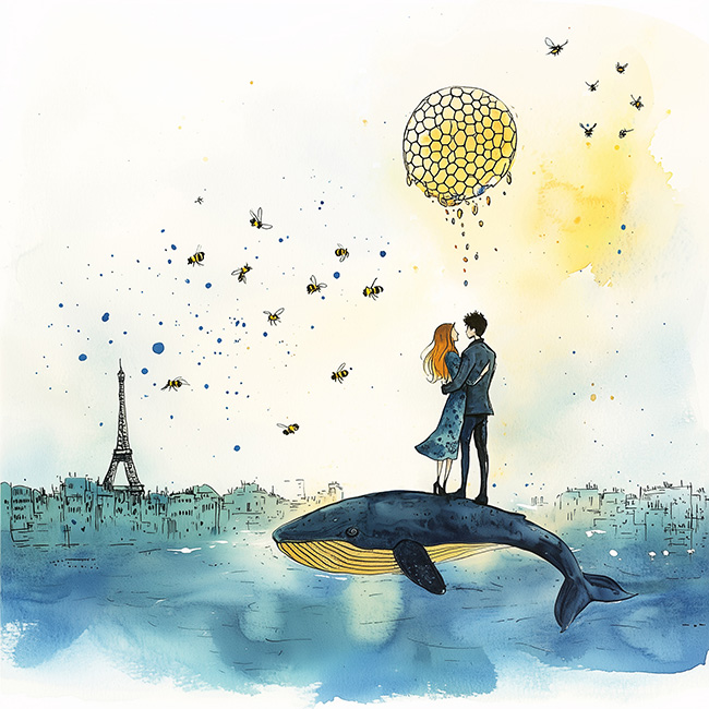 In Paris, love is definitely sweeter. Under the glow of the honeycomb moon, a warm light poured down like golden syrup, bathing the cobblestone streets in a gentle radiance. I could almost hear Joe Dassin’s voice whispering, “Sous le ciel de Paris, s’envolent les chansons,” as the melodies of the city wrapped around us, pulling us deeper into its embrace. But the real magic came from the humming bees that filled the night sky—special bees, I like to think, born from the moon’s sweet essence to bring joy to lovers wandering beneath its glow. Their buzzing was like a symphony, setting the perfect backdrop for our romantic adventure.